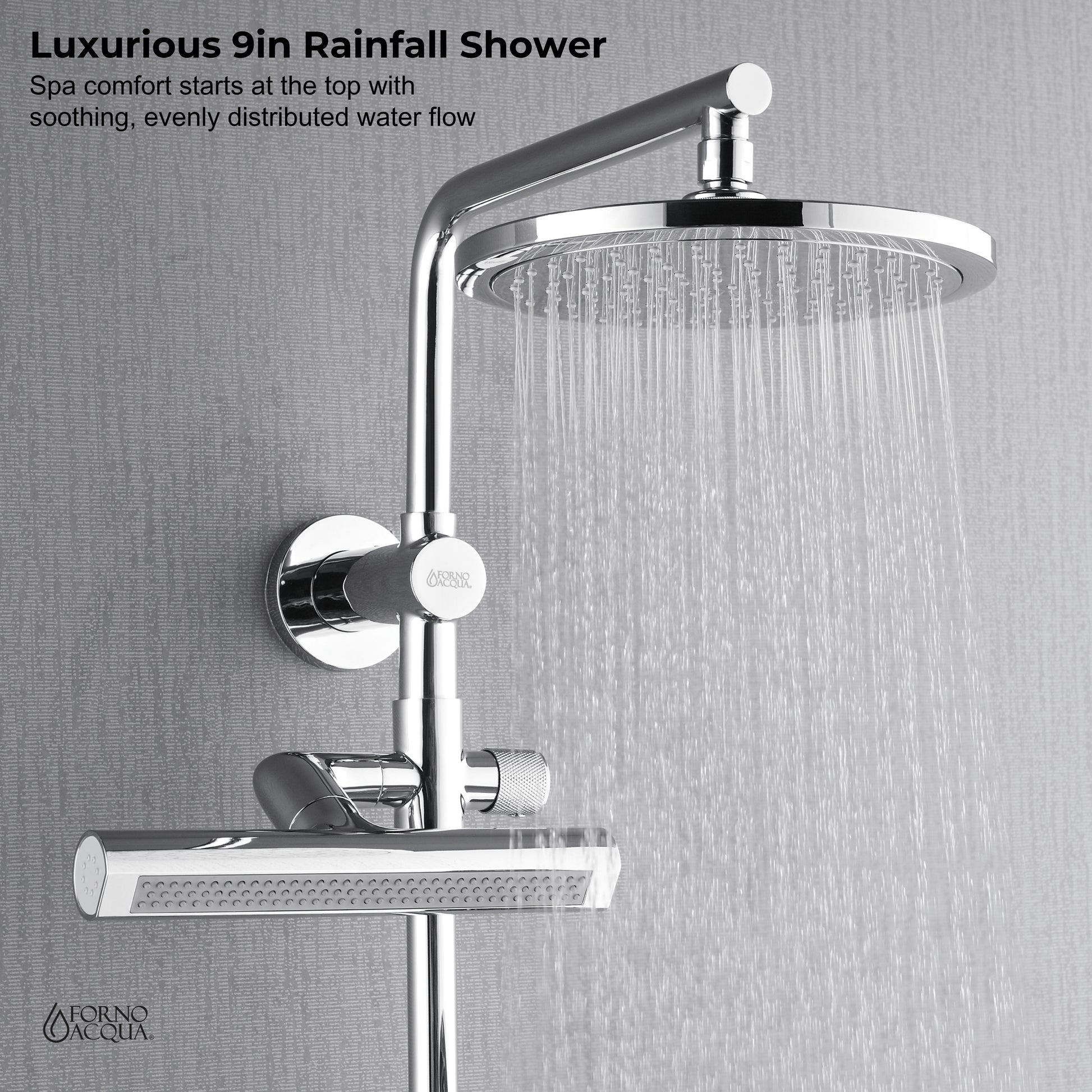 Forno Acqua AcquaFALL Shower, Polished Stainless Steel Finish, Overhead Rainfall Shower, Handheld Shower Head, Body Jets, 2.5 GPM Flow Rate