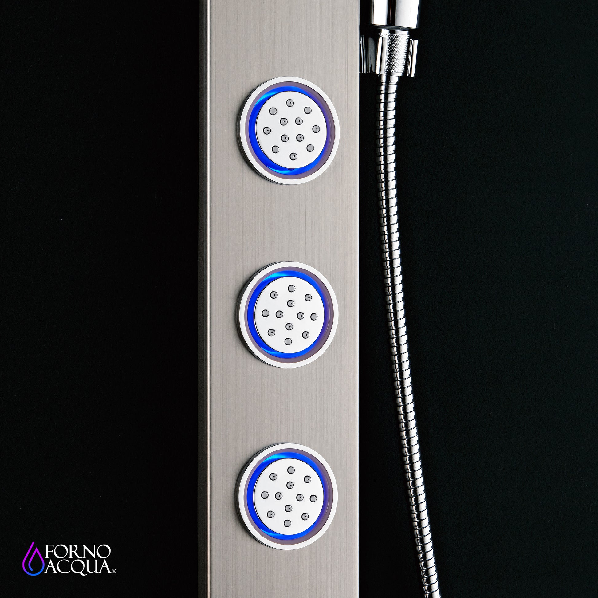 Forno Acqua AcquaSpa Shower Panel with SensoTemp, Stainless Steel, Overhead Rainfall Shower, Handheld Shower Head, Body Jets, 2.5 GPM Flow Rate