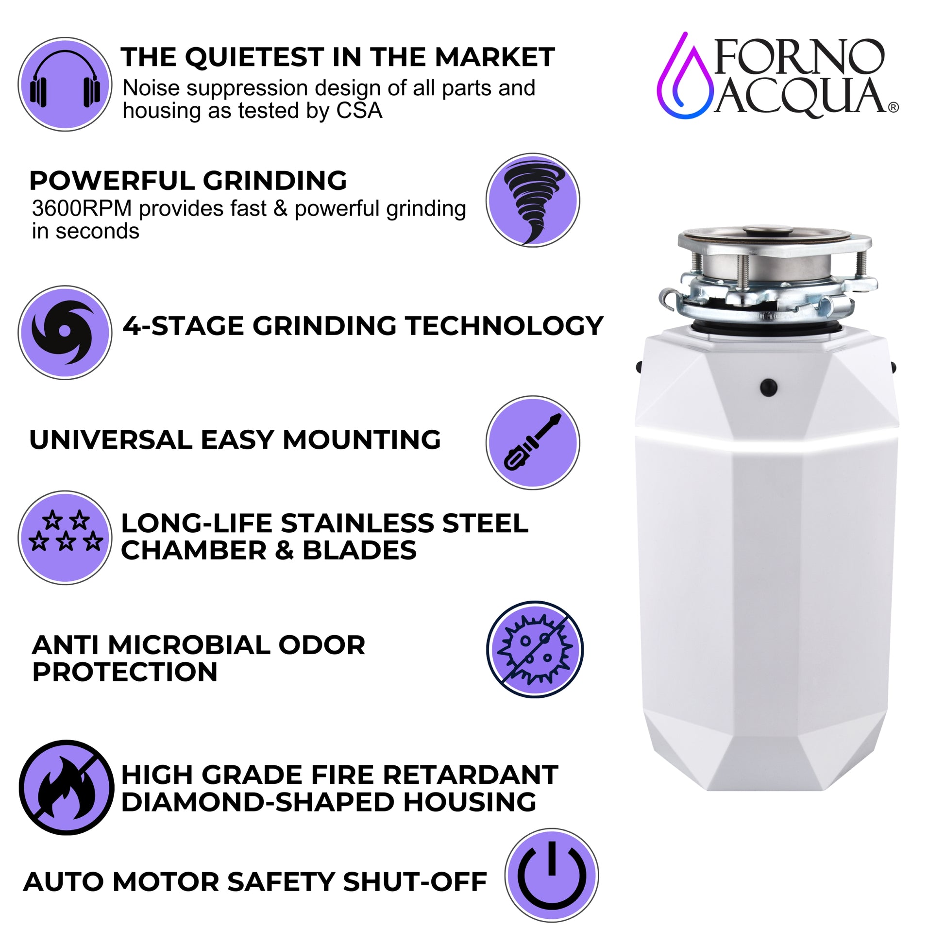 FORNO ACQUA BrightDIAMOND Moonstone 3/4HP Super Quiet Garbage Disposal Corded with Motion Sensor Cabinet Light & Pre-Wired Air Switch