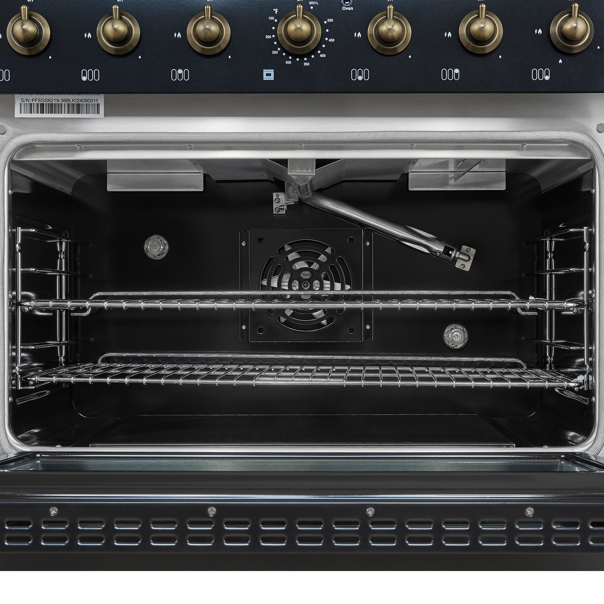 Forno Antico 36-Inch Freestanding Gas Range, Black, Antique Brass Design, 6 Burners, Convection Oven, Energy Efficient