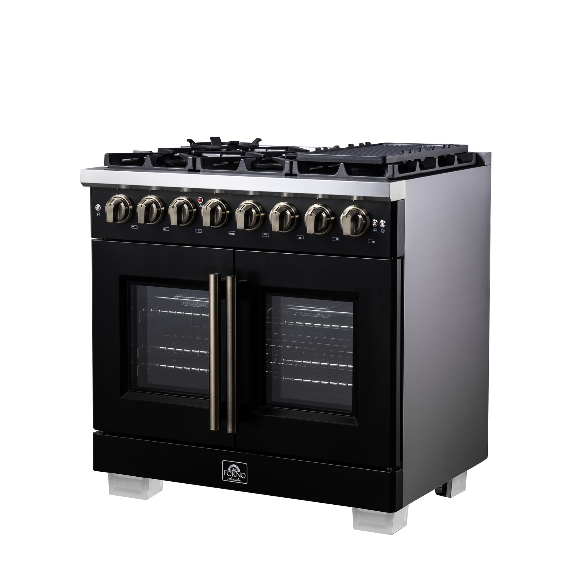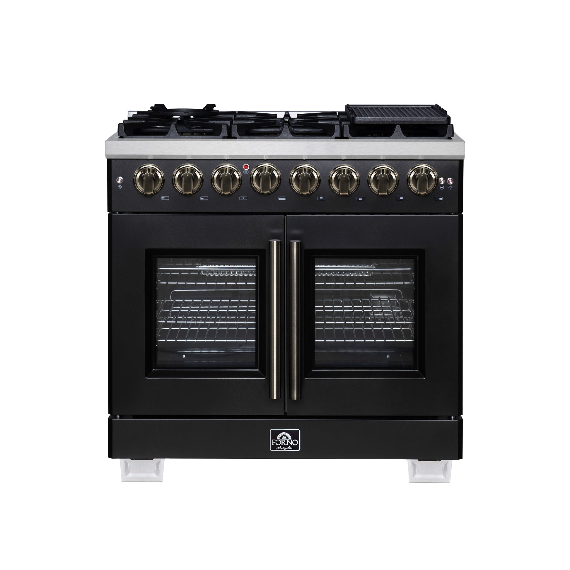 Forno Capriasca 36 Inch Freestanding French Door Dual Fuel Range in Black with Antique Brass Accessories, 6 Burners, True Convection Oven