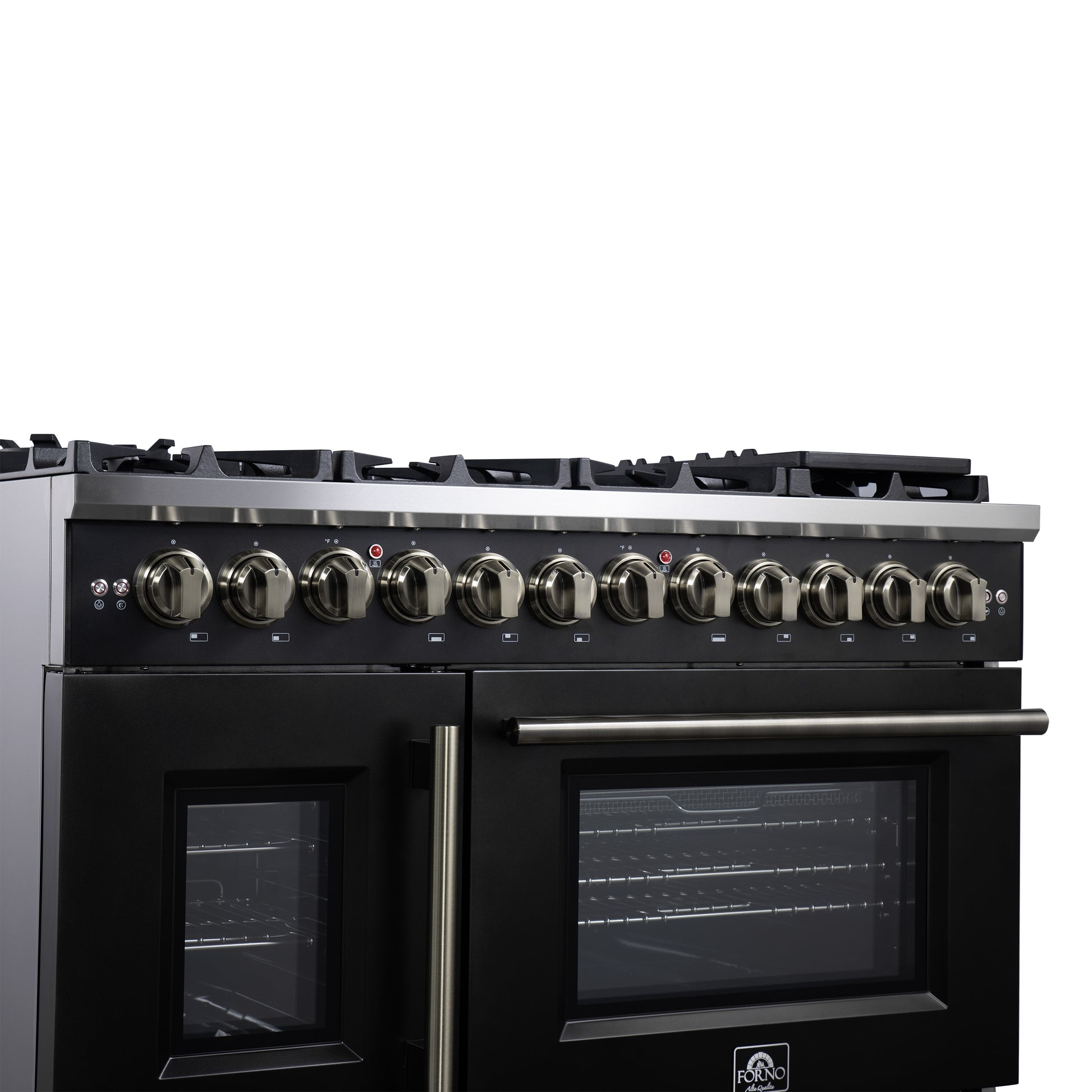 Forno Capriasca 48 Inch Freestanding French Door Dual Fuel Range in Black with Antique Brass Accessories, 8 Burners, True Convection Oven