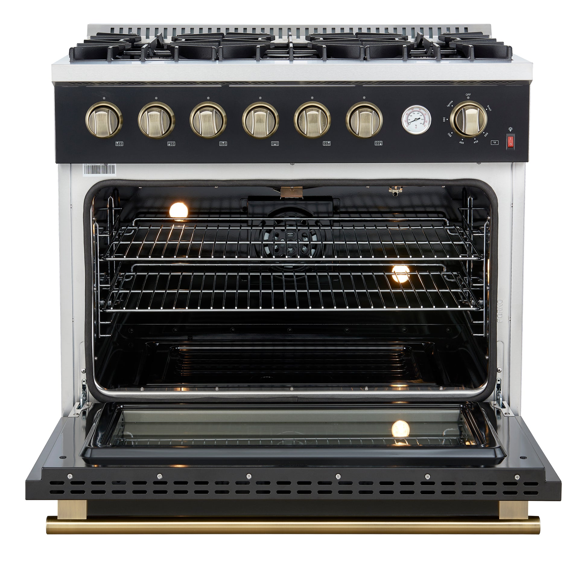 Marco 36-Inch Gas Range Black & Antique Brass Design, 6 Burners 67,000 BTU, 5.36 cu.ft. Convection Oven